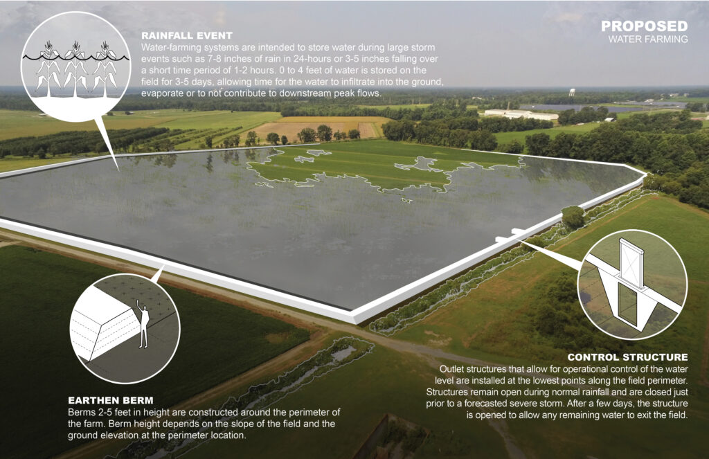 Water Farming is a practice where stormwater is held for a short period of time and then released after the flooding event has subsided.